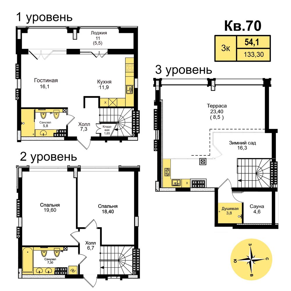 Мечтаете о собственном пентхаусе в Калининграде? Лучшее решение — именно эта роскошная квартира. Три уровня комфорта, 133 кв.м жилой площади, а эксплуатируемая кровля — оригинальное архитектурное решение и безграничные возможности для дизайна. На первом уровне — объединенные гостиная и кухня 28 кв.м, балкон 13,7 кв.м, холл и санузел. Второй уровень — две спальни и просторная ванная комната, третий уровень — зимний сад, сауна, душевая. Открытая терраса — «изюминка» квартиры и дополнительная площадь для релакса и встреч с друзьями.