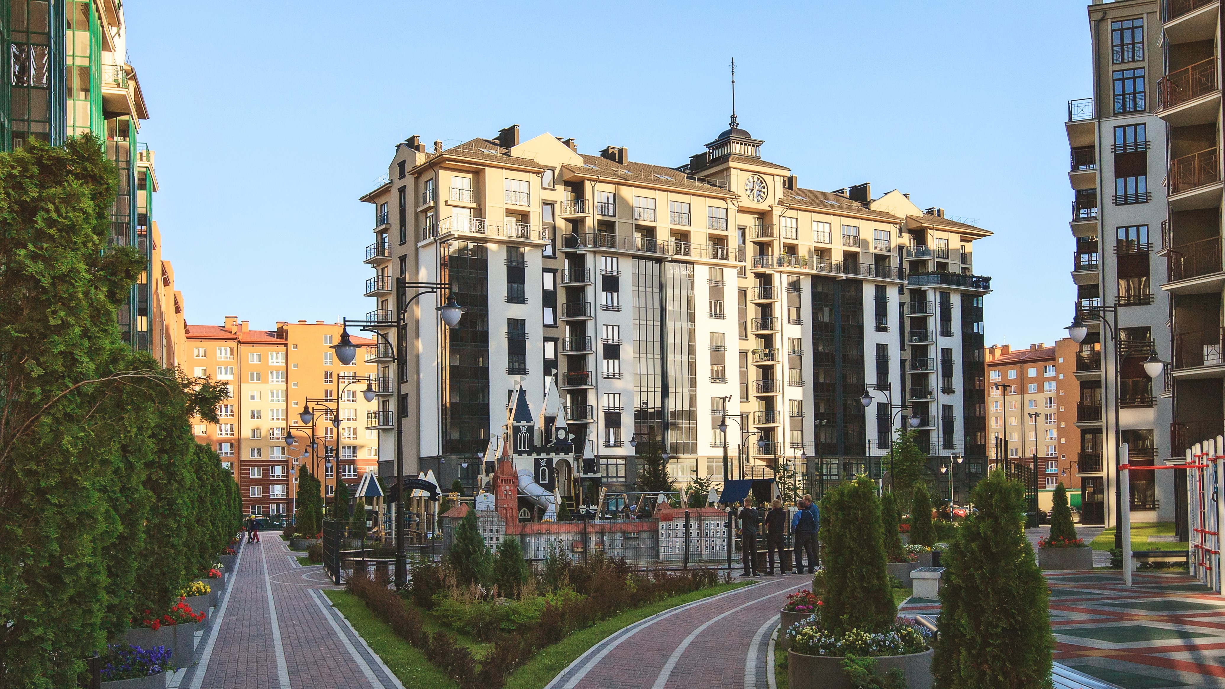 Благоустройство и озеленение доставляет такую же радость, как и архитектура зданий, выполненных в стиле неоклассицизма в современном его прочтении. Над каждым домом - башня с подсветкой, в одной из них часы, которые своим боем напоминают нам о родной Москве. Освещение двора и зданий так удачно исполнено, что ловишь себя на мысли: «А в России ли ты находишься?»